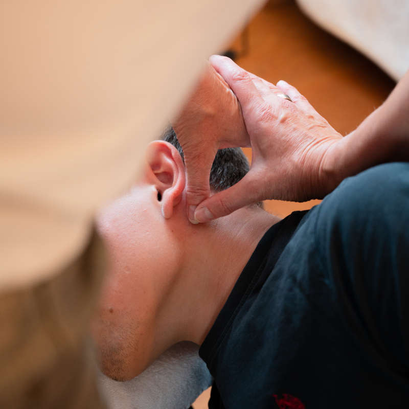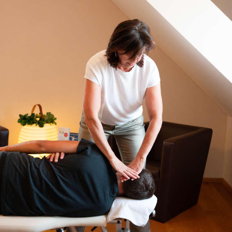 Ein präziser, sehr schneller und schmerzfreier Impuls an der seitlichen Halsmuskulatur löst Verspannungen und bringt den Körper ins Gleichgewicht.